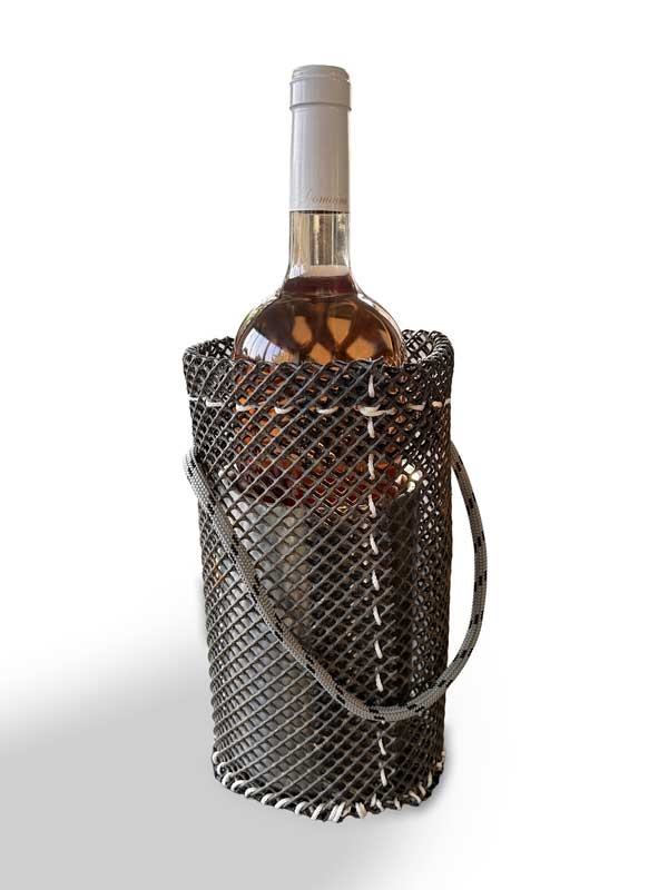 Porte-bouteille XL en poche ostréicole recyclée, avec anse en cordage technique issu du nautisme. Fabriqué à la main à l’ESAT ADEI d’Arvert, il accueille un magnum ou un rafraîchisseur inox. Un objet malin, durable et solidaire, né du savoir-faire maritime