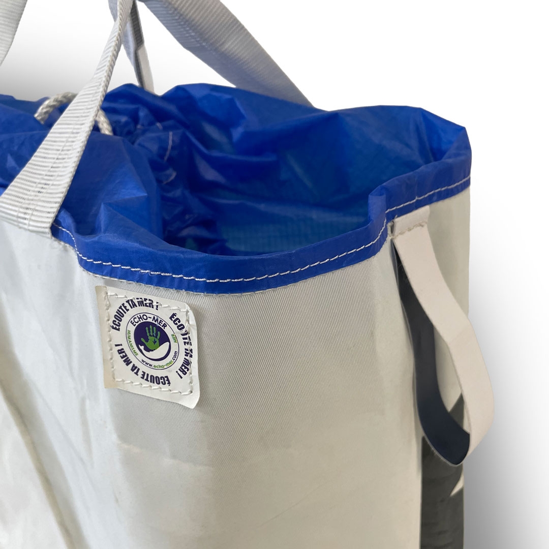 Grand sac de tri en matériaux recyclés, robuste et léger. Conçu pour le tri sélectif à bord des bateaux mais parfait aussi à la maison pour le rangement du linge ou des affaires du quotidien. Fabriqué dans un atelier de réinsertion solidaire, durable et engagé