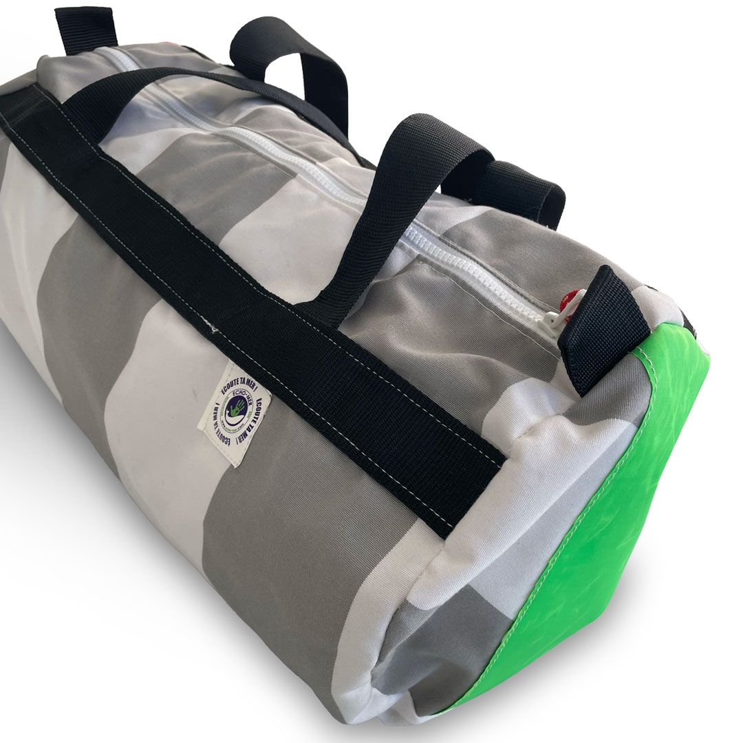 Découvrez ce magnifique sac de sport polochon en voile de bateau et bâche publicitaire recyclées, qui allie style, robustesse et engagement solidaire ! Son design cylindrique aux bandes grises et blanches, rehaussé de touches fluo orange-rouge et vert aux extrémités, en fait un accessoire sportif unique et remarquable. Parfait pour la salle de sport, la piscine, les week-ends ou les courts séjours.