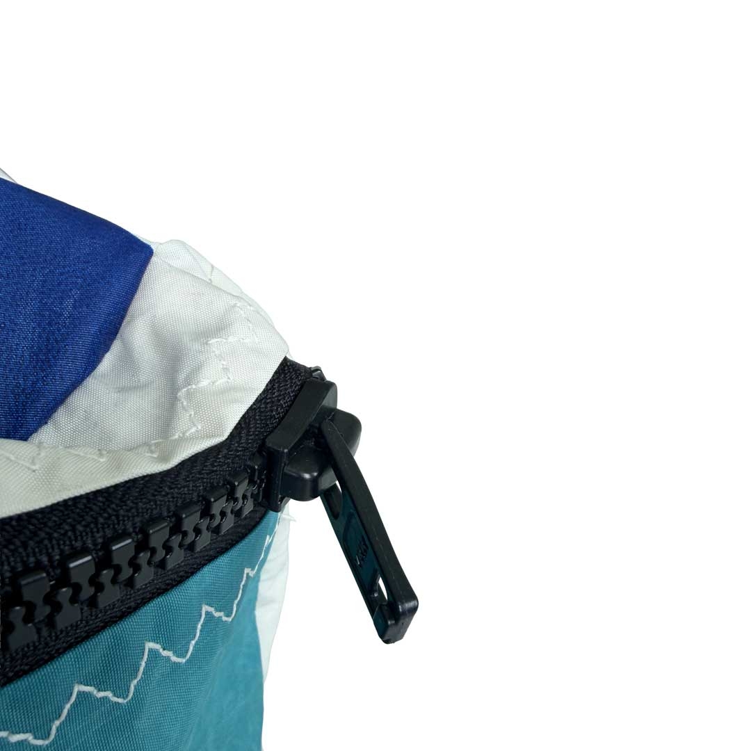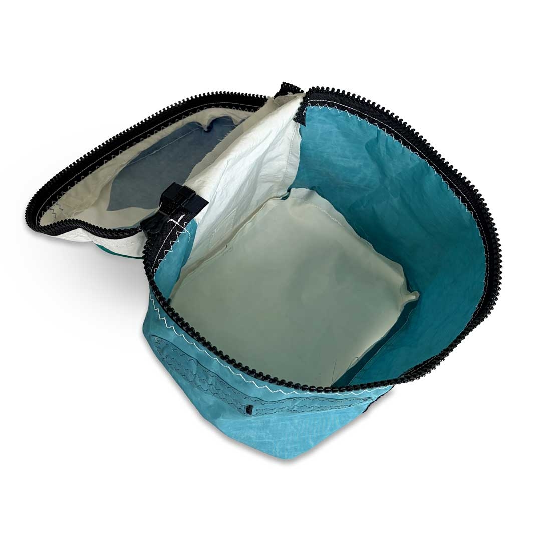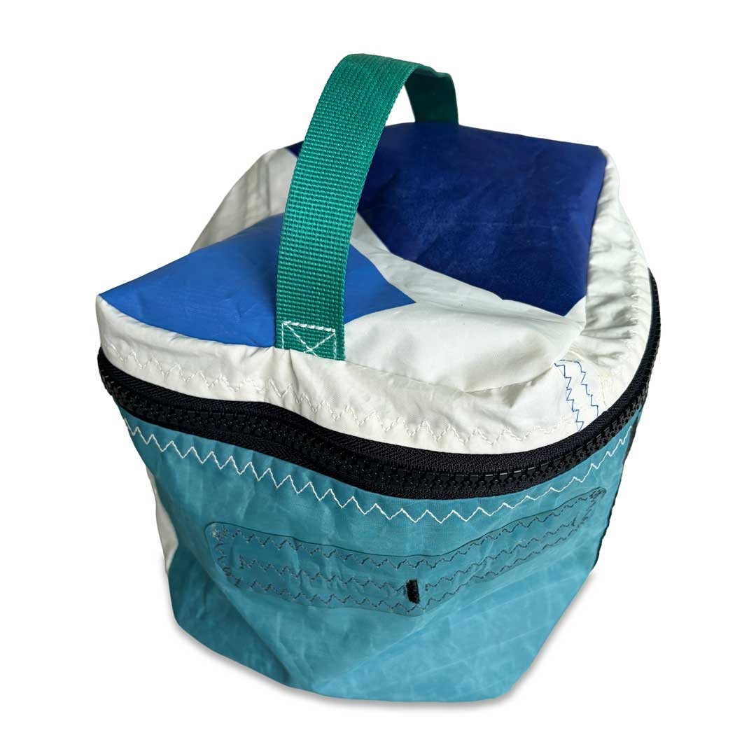 Grande trousse cubique turquoise en voile de bateau recyclée avec ouverture zippée supérieure et poignée. Spacieuse et pratique, format voyage ou quotidien, fabriquée en atelier solidaire.