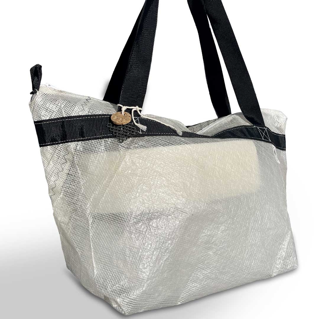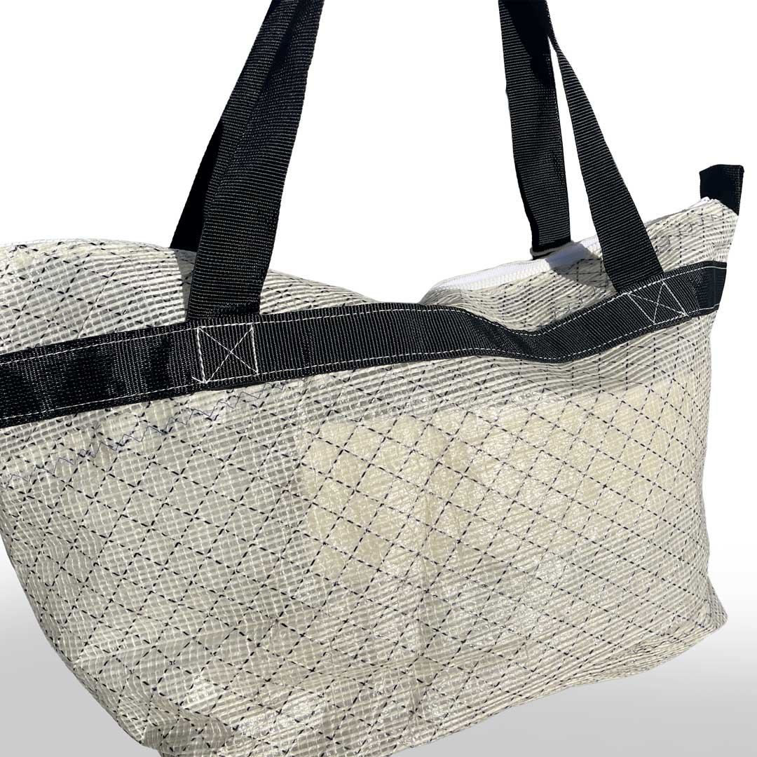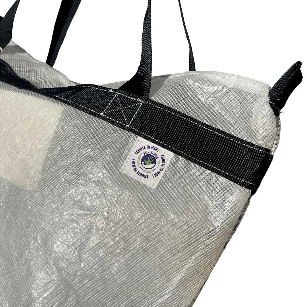 Sac en voile de bateau revalorisée, léger, robuste et unique. Chaque modèle présente un recto et un verso différents, reflétant l’histoire des voiles recyclées. Un grand sac durable pour le marché, la plage ou vos escapades, fabriqué à la main dans une démarche locale et solidaire
