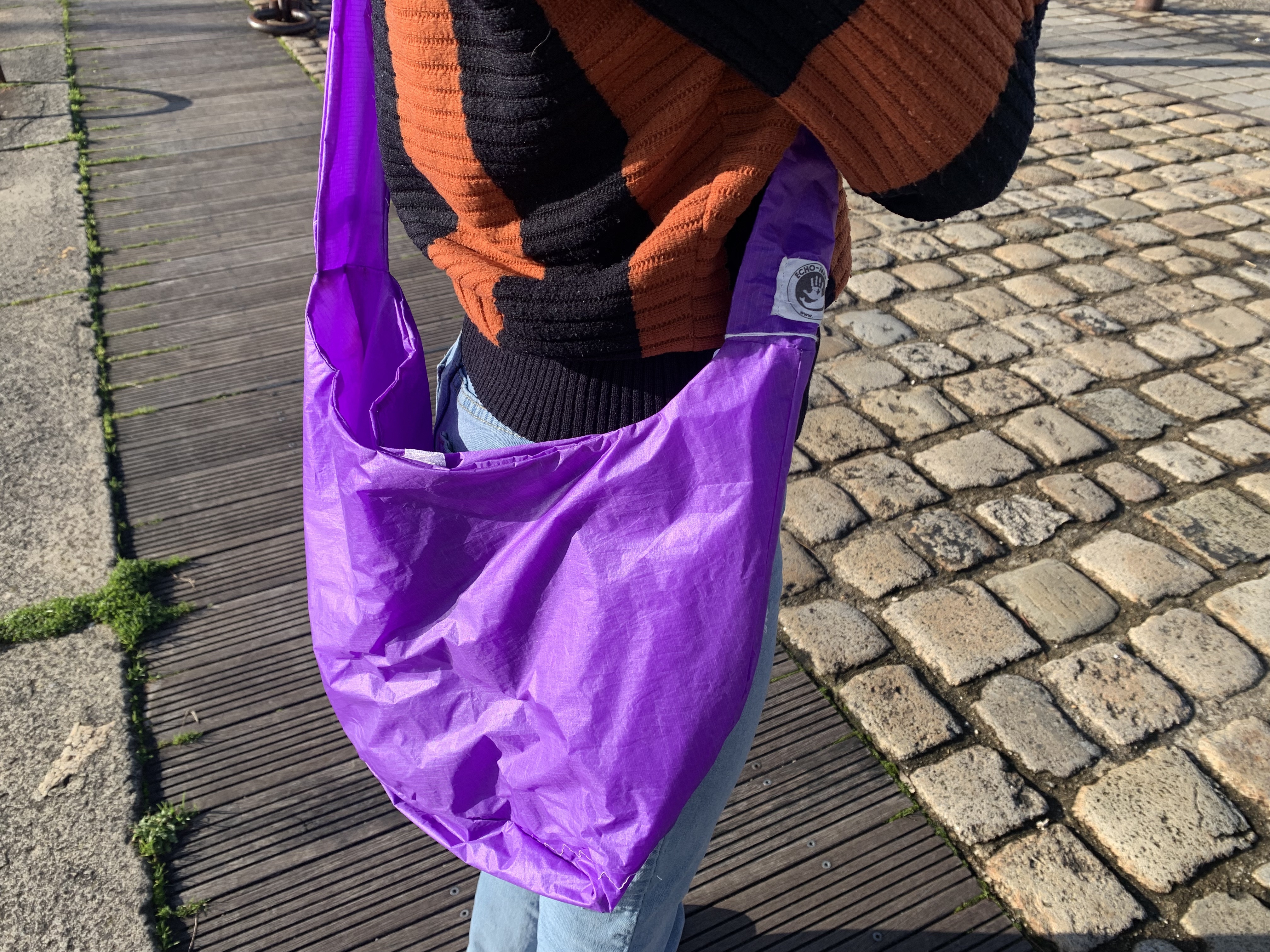 Sac bandoulière en voile de bateau recyclée violette, fabriqué à la main dans une démarche circulaire et solidaire. Léger, robuste et unique – l’allié parfait pour vos journées actives ou vos escapades marines ♻️