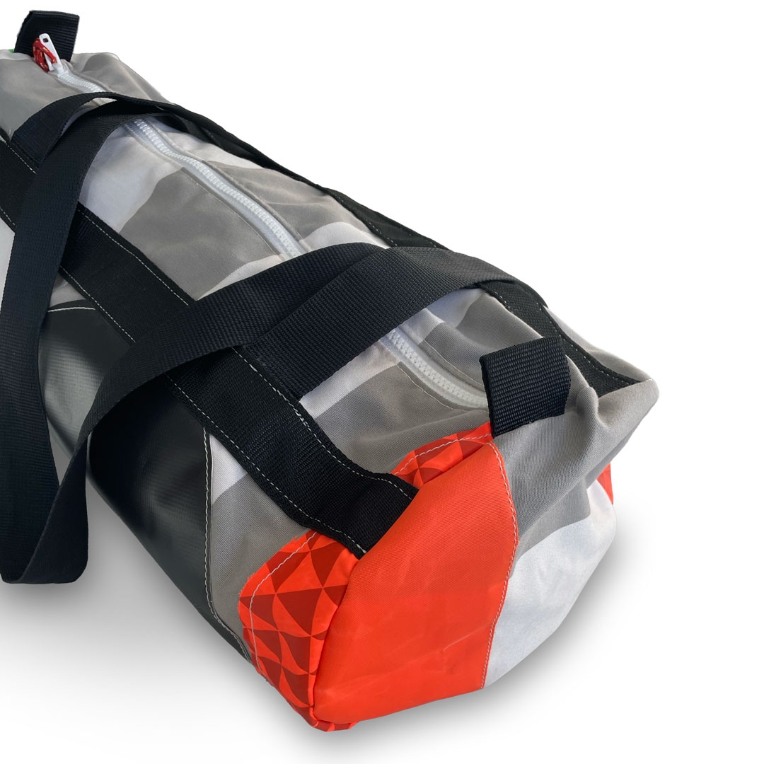 Découvrez ce magnifique sac de sport polochon en voile de bateau et bâche publicitaire recyclées, qui allie style, robustesse et engagement solidaire ! Son design cylindrique aux bandes grises et blanches, rehaussé de touches fluo orange-rouge et vert aux extrémités, en fait un accessoire sportif unique et remarquable. Parfait pour la salle de sport, la piscine, les week-ends ou les courts séjours.