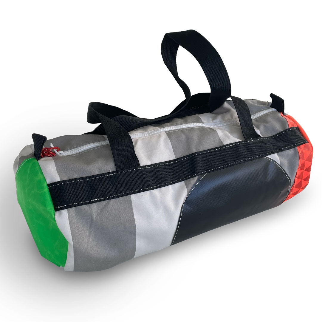Sac de sport cylindrique en voile et bâche recyclées, design coloré blanc-gris avec touches rouge et vert. Résistant et esthétique, fabriqué en centre pénitentiaire pour la réinsertion professionnelle.